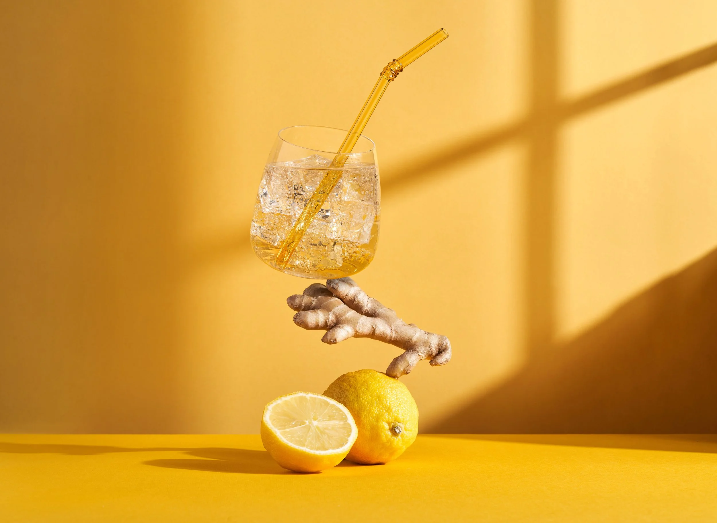 Product photography and editing using OLIPOP Lemon Ginger Seltzer.
